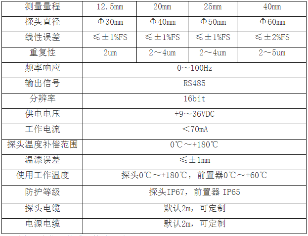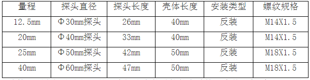 通常探头由线圈、头部、壳体、高频电缆、高频接头组成。在制作过程中,探头头部体一般采用耐高温PPS工程塑料,通过“二次注塑”成型将线圈密封其中。使探头在恶劣的环境中能可靠工作。由于头部体线圈直径决定传感器系统的线性量程,因此我们通常用头部体外部直径来分类和表征各型号探头,一般情况下传感器系统的线性量程大致是探头头部直径的1/2~1/4倍。ML33系列传感器探头见表格: