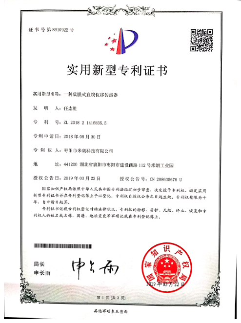 碳膜直线位移传感器证书