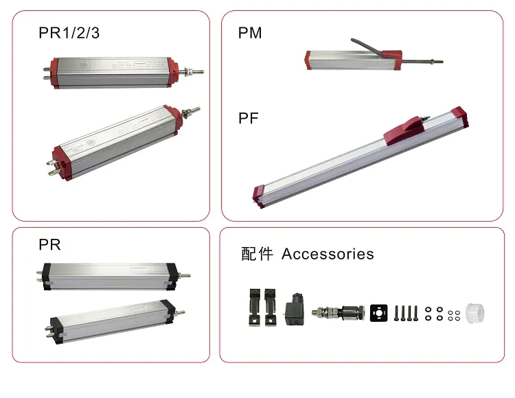 PR系列为拉杆式位移传感器,PM系列为微型拉杆式位移传感器,PF系列为滑块式位移传感器。PR/PM/PF系列位移传感器(别名:电子尺,电阻尺,电位器,直线位移传感器)原理:电位计原理,所有传感器为位置测量型,用于调节系统(控制系统)和测量系统中,对位移和长度进行直接测量,输出直流电压信号,也可以通过内置或者外置的V/A变送模块讲信号转换成标准的0-5V、0-10V或者4-20mA直流信号,也可以远距离传输控制要求。PR/PM/PF系列位移传感器(别名:电子尺,电阻尺,电位器,直线位移传感器)输出位移变化:0-给定输入工作电压(随位移变化而变化)。