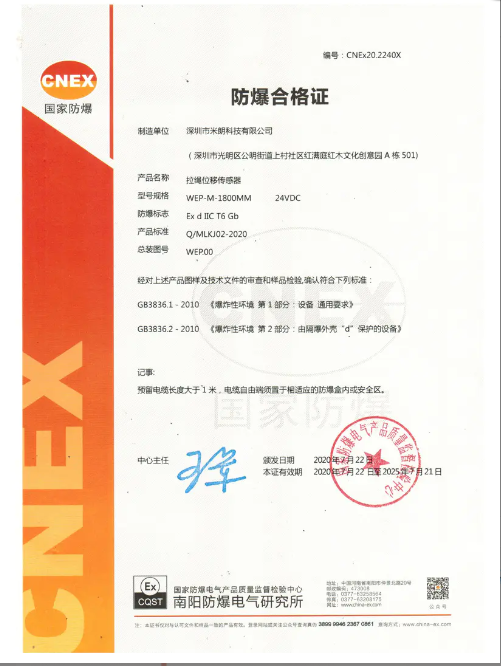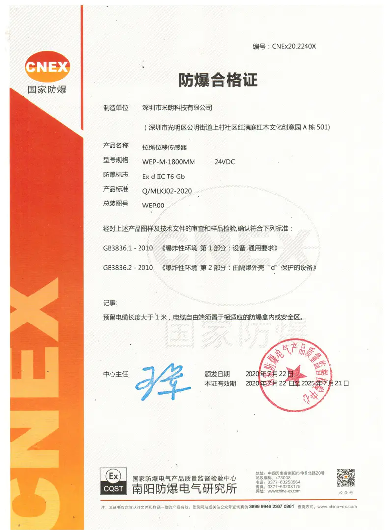 拉绳位移传感器防爆证书