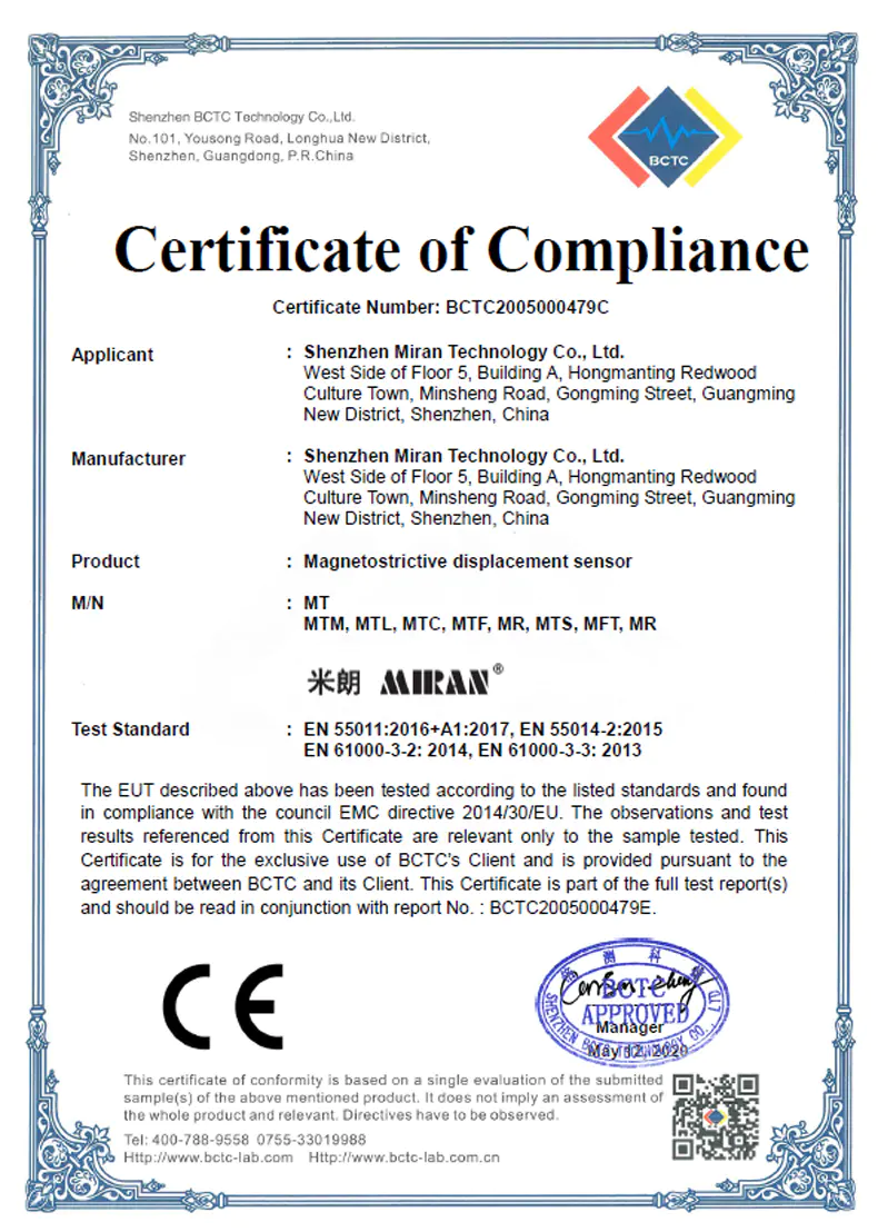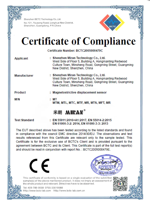 磁致伸缩位移/液位传感器CE证书