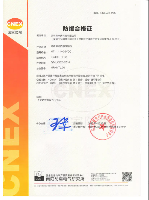 磁致伸缩位移传感器防爆证书