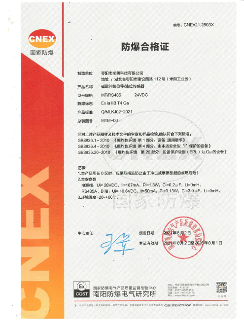 磁致伸缩位移/液位传感器RS485输出本安认证