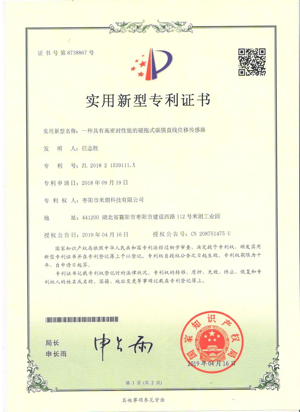 米朗科技荣任湖北省传感器行业协会副会长单位证书