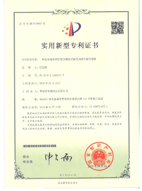 磁拖式碳膜直线位移传感器证书
