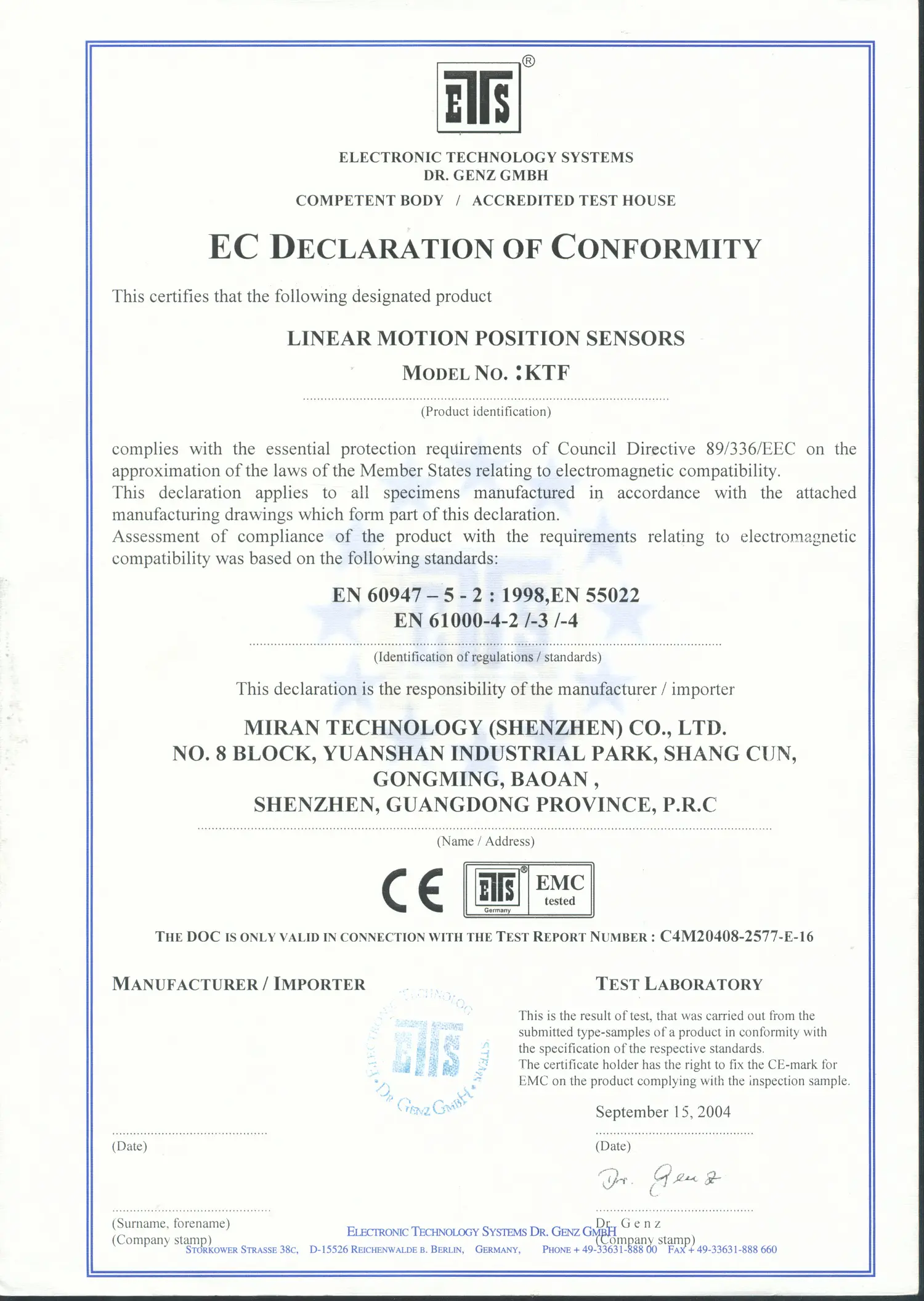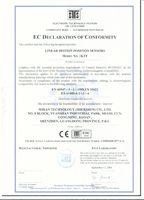 KTF直线位移传感器CE认证证书