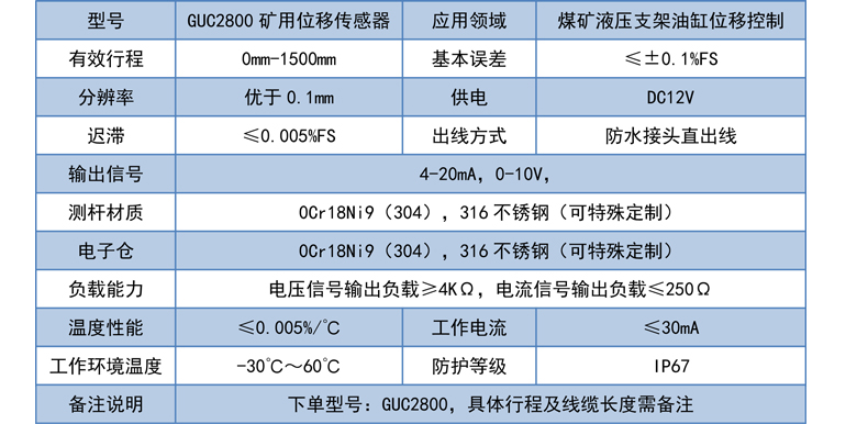 二、GUC2800矿用本安磁致伸缩位移传感器技术参数: